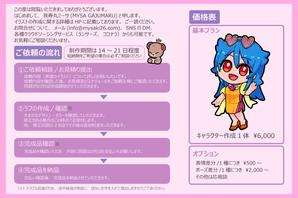 ・版権作品のイラスト作成について、必ず作品のガイドラインをご確認の上ご依頼ください。